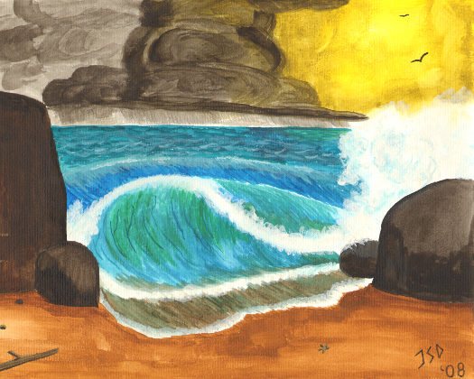 Another wave crashing on a sandy beach between rocks. The sun struggling in the background, to shine through stormy clouds.