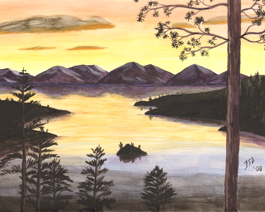 A small island sits in a calm lake with the sun setting behind the purple mountains in the background.