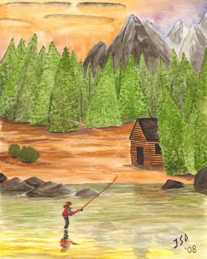 With the sun setting behind the mountains, a lone mountain man casts for his supper, yards from his cabin.