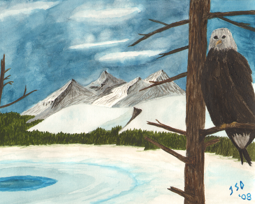 An eagle watches over an almost frozen pond at the foot of a mountain