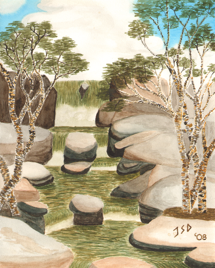 A river tumbles across drops and rocks as it cuts its way from one level to another. Trees cling to what little soil they find between the rocks.