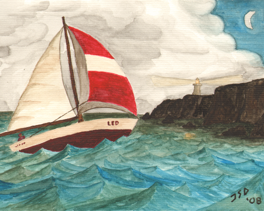 A sailboat navigates the choppy waters beneath the cliffs, under the watchful eye of a lighthouse.