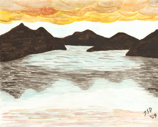 Abstract depiction of clouds reflected in a lake nestled between mountain ranges.