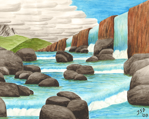 Another series of waterfalls cascading over a cliff and joining up in a rock littered river.