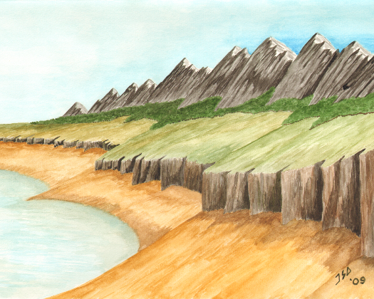 From the mountain range, through the trees, across grassy fields, over the cliff and down the sandy beach, the scene slopes to the sea.
