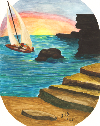 At the rocky base of a rugged cliff a sailboat plays in the sunset.