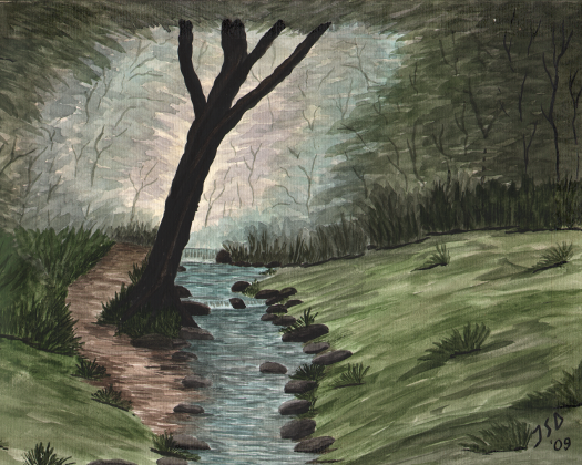 A narrow path follows a creek through a dense forest. I love the shimmering trees, appearing to dance in the background.