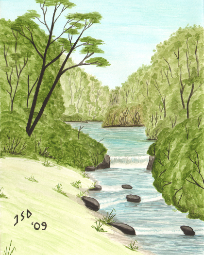 Relaxing scene of a grassy bank beside a tree lined creek.