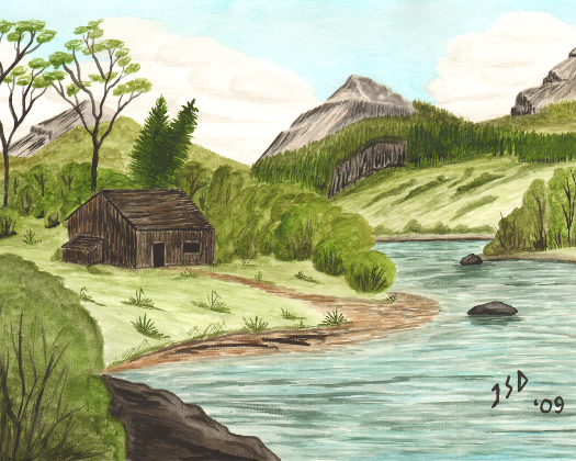 Secluded cabin on the banks of a high mountain stream.