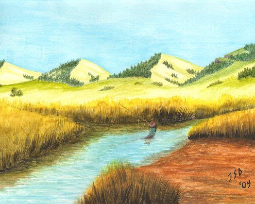 Hopeful fisherman stands at the confluence of two small rivers,