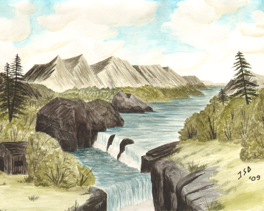 Cabin sits on the edge of a river that pours lazily over the falls.