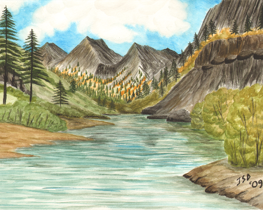 Colorful aspen trees climb the steep mountain slopes under a cloudy sky. While not an exact representation of the Maroon Bells, I painted this after seeing an image of those high mountain valleys of Colorado!