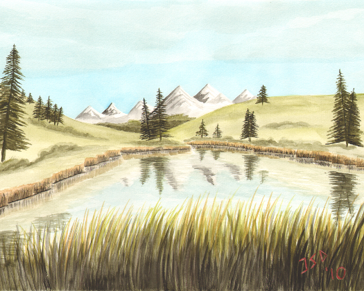 Grassy weeds rise out of a swampy marsh. In the background, evergreen trees dot the green slopes at the base of a snowy mountain range.