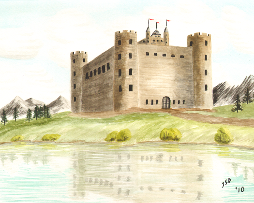 Reflected in the quiet lake, an impregnable castle, dominates the scene.