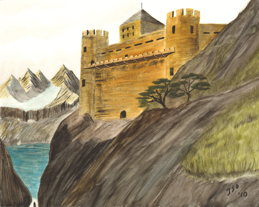Stone Castle clings precariously to the side of a steep cliff, looking down on a rough river deep in the ravine. |