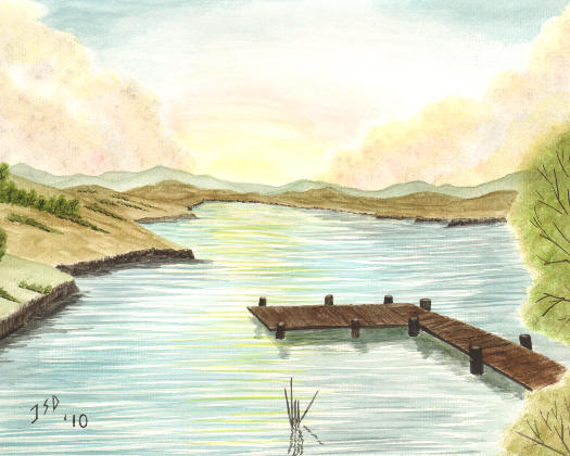 Dock sits on a quiet pond as the sun sets on the far side of the pond.
