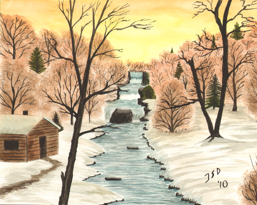 Early snow blankets the banks of a small creek. Bare trees contrast against a golden sunset. Beautiful setting for a small cabin.