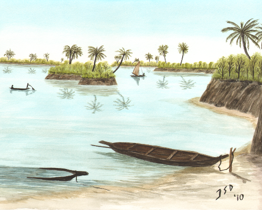 Dug out canoes beached on the shore of the Benue River during the dry season.