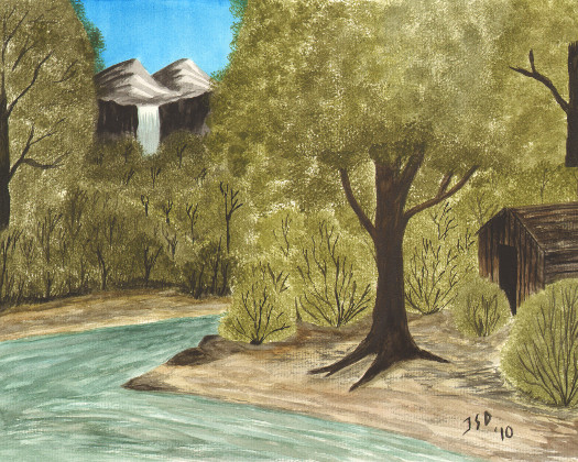 Cabin sits on the shore of a lazy river waiting for what may come around the bend. In the background, a waterfall plunges into the trees.