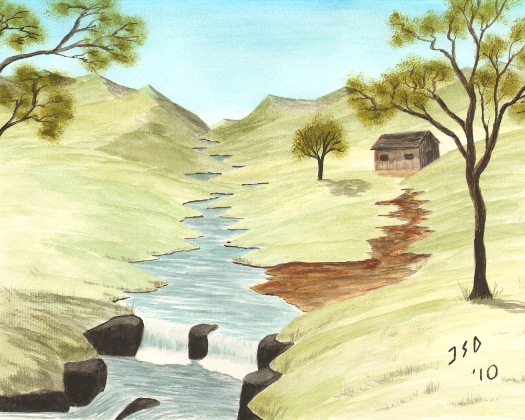 A small brook winds down between the mountains and converges with a narrow path running down the slope from a cabin.