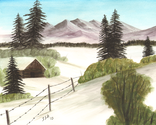 A blanket of snow covers the countryside beneath the mountains. Sheltered from the wind by trees and brush, a sturdy cabin waits for the coming spring.